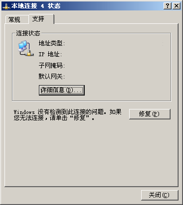 2、双击本地连接,点支持选项卡,所有内容(地址类型、ip地址等)后面的内容均是空白。(dhcp自动获取ip地址,正常下应有内容)