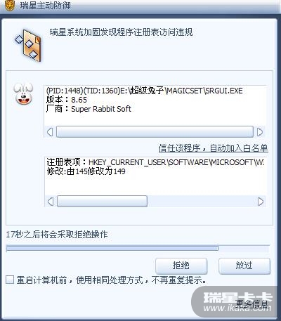 瑞星系统加固时发现超级兔子违规,我是不是应该允许超级兔子通过,瑞星处理图如下: