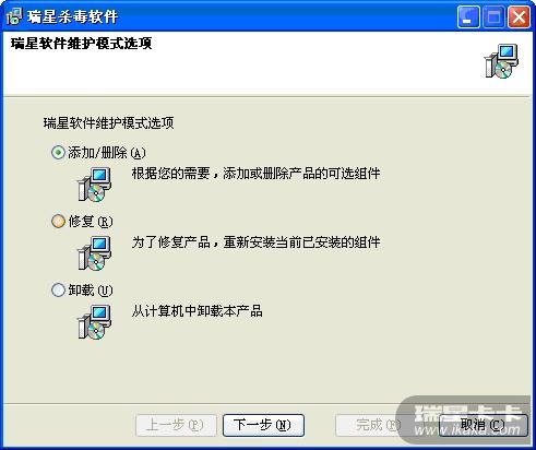 【修复】:选中此项后,程序会对现有的瑞星杀毒软件进行修复安装,检查已安装的瑞星杀毒软件的完整性,并修复存在的问题。便于用户更稳定地使用瑞星杀毒软件
