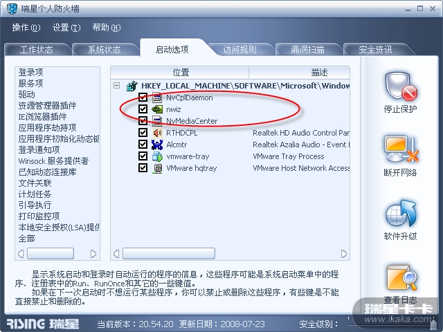 我的建议是把紫光拼音这个程序删掉,把NV显卡的启动项删掉(这个可以在瑞星防火墙中处理,超级兔子也行)。