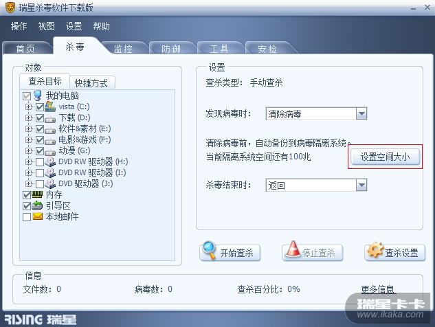 点击运行,进入隔离系统的界面然后通过操作-清空,就可以清空隔离区的病毒。另外如果提示空间不足可以通过设置隔离区的大小,方法如下图: