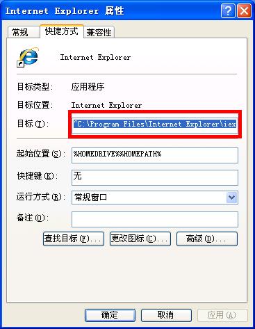 注:弹网页的问题可能与此无关。请找到C:\Documents and Settings\Administrator\「开始」菜单\程序\Internet Explorer这个快捷方式,右键选择“属性”,看看图中红框位置处的数据是不是"C:\Program Files\Internet Explorer\iexplore.exe",如果有多余的尾巴,删除多余的部分……