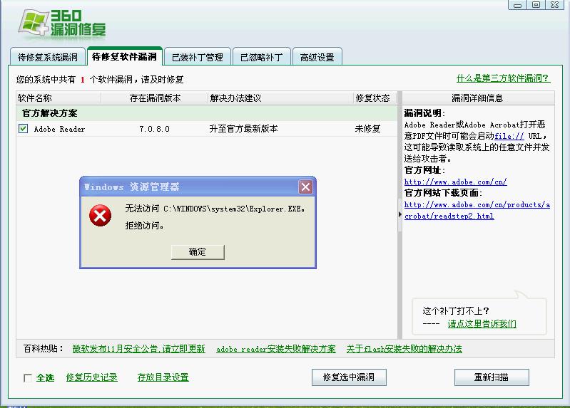 下面有图,附带说明一下:360其他组件没有问题。就是漏洞这个老提示错误!问题的出现时再点击右面下载页面时出现!刚才我试了一下,点击漏洞组建对话框上的所有链接都会出现这个问题。不知为什么。别的没问题!从360下载了修复工具,提示重启,重启之后还是不行!