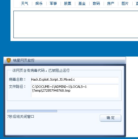 但是,如果浏览任何网页都会出现此报毒提示,那么就有arp病毒攻击欺骗的情况,某些病毒利用ARP欺骗等手段,在用户收到的网络数据包中自动插入iframe代码,代码指向利用MS07-017漏洞的网址。使得中毒用户,以及局域网中受到此中毒电脑的欺骗攻击的用户,在上任意网站的时候,均会出现脚本病毒或网页木马的报警。针对这种情况,我们建议您首先把补丁打上,其次核实如果是自己的电脑中了毒,应及时清空IE临时目录,升级杀毒;如果是别人的电脑中毒后攻击自己,则下载第三方抓包工具(如sniffer或者antiarp),查找病毒源,找到毒源后,使用瑞星听诊器扫描并上报扫描结果。