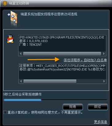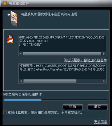 有哪位大侠知道这是怎么回事吗?每次登陆QQ以后,瑞星主动防御就提示这个!