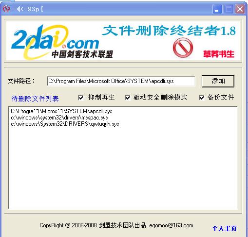 运行xdelbox前最好卸载所有可移动存储介质(包括U盘,MP3,手机存储卡等)。 C:\Program Files\Microsoft Office\SYSTEM\apcdli.sys