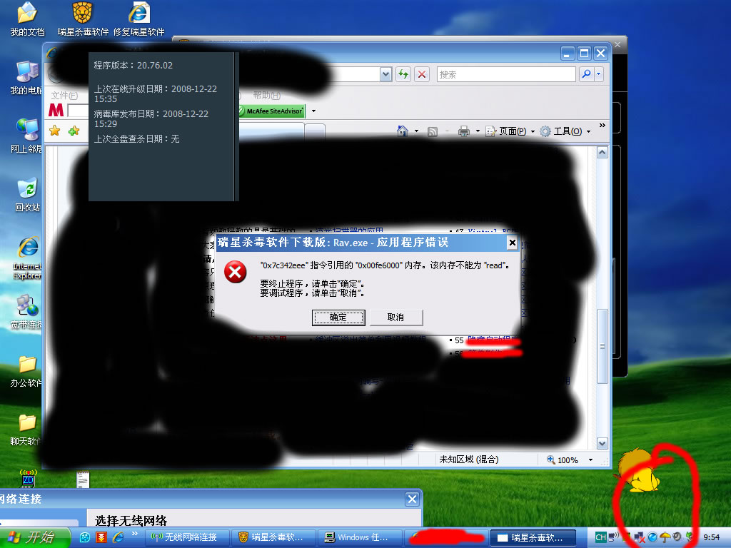 今天早上我的瑞星图标变黄,邮件监控打不开,疑被感染。病毒库更新到最新版扫描的时候频繁出现这样的问题.....