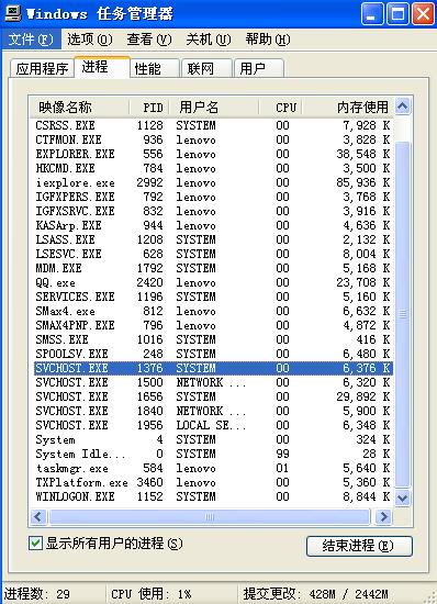 症状:任务管理器!多了几个svchost.exe程序  (有5个相同的)很多进程的内存使用都很高