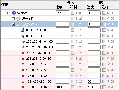 今天网速爆慢,查看了下网络连接,看到system下进程(928)里有很多连接,而且很不稳定,时而只有两个(就是图里那两个绿色箭头的),时而又有几十个(是突然出现的,过一会又没了)。