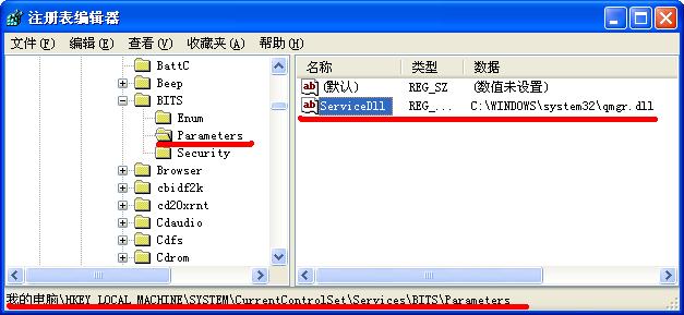 把HKEY_LOCAL_MACHINE\SYSTEM\CurrentControlSet\Services\BITS\Parameters\ServiceDll这个注册表值项的数据按照我下图修改下,然后重启电脑看下: