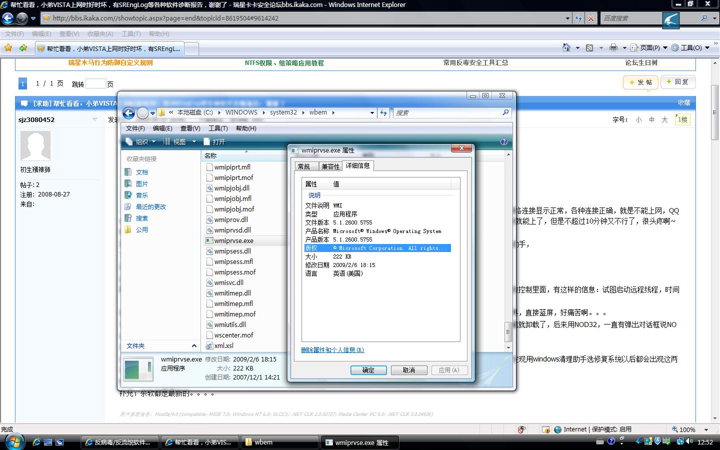再补充一下:瑞星杀毒经常有提示框说自我保护,我估计是病毒的攻击,我在历史记录里面找到了,发现在自我保护——系统函数控制里面,有这样的信息:试图启动远程线程,时间(大概看了一下,每次都在同一秒钟内,会攻击7次),进程名称c:\windows\system32\WBEM\WMIPRVSE.EXE。