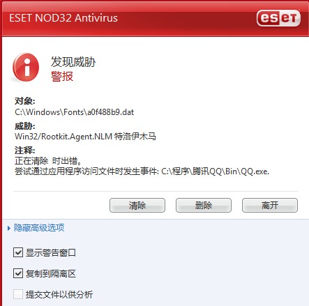 今天一上QQ就被NOD32发现有木马,但是删除不了.....