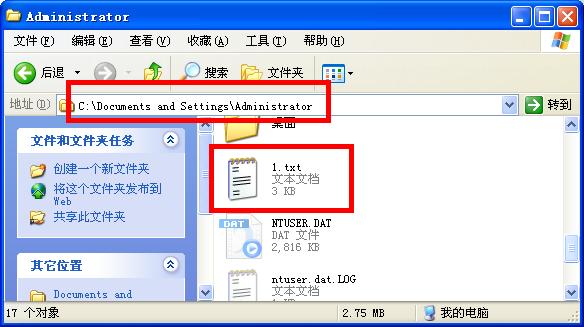 接着,你就可以到c:\documents and settings\administrator目录(你在命令提示符下什么路径下(下图1处)输入的命令,就是1.txt所在的路径)下去找这个1.txt,如图,我就在这里找到1.txt,简单吧……
