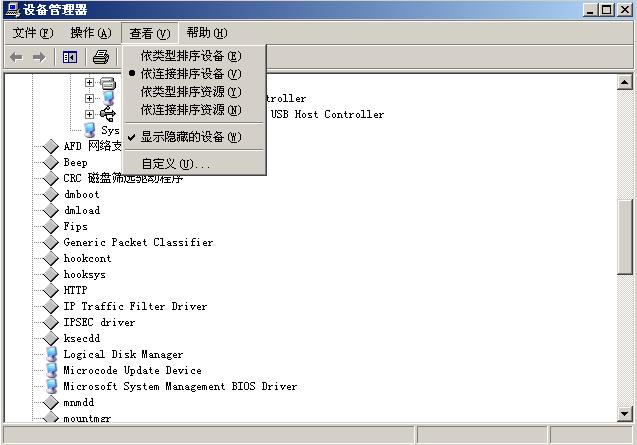 4.在设备管理器上,显示所有隐藏设备后,找到病毒文件对应的驱动,将其停用和卸载后,直接删除染毒文件。