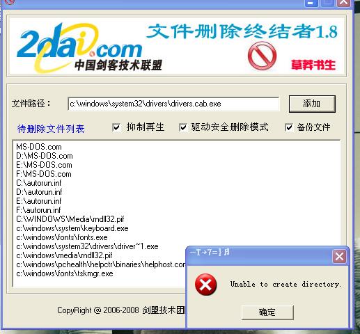 使用说明:(先勾选抑制再生)删除时复制所有要删除文件的路径,在待删除文件列表里点击右键选择从剪贴板导入不检查路径,导入后在要删除文件上点击右键,选择立刻重启删除,电脑会重启进入DOS界面进行删除操作。运行xdelbox前最好卸载所有可移动存储介质(包括U盘,MP3,手机存储卡等)。