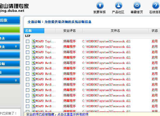 ]星杀下毒,什么也没有了.但是金山清理专家的LSP项上显示还有几十个病毒程序被启用(看附件)我不知道怎么弄