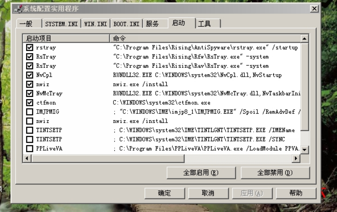 瑞星的不可以取消开机启动,至于那输入法那个建议也不要取消开机启动,不然你每次要打字都要重输这个命令才能打字!那个NWIZ的开机启动好像有点问题,没有路径也不是什么系统程序,建议全盘杀毒!!其它的都是必要的启动!