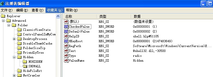 开始---运行---输入REGEDIT---修改 HKEY_LOCAL_MACHINE主键下子键Software/Microsoft/Windows/CurrentVerssion /explorer/Advanced/Folder/Hidden/SHOWALL下的值CheckedValue,值为0 的时候,在工具里显示,是显示不出隐藏文件的。 只要把值改回1,就可以在工具里显示出隐藏文件了