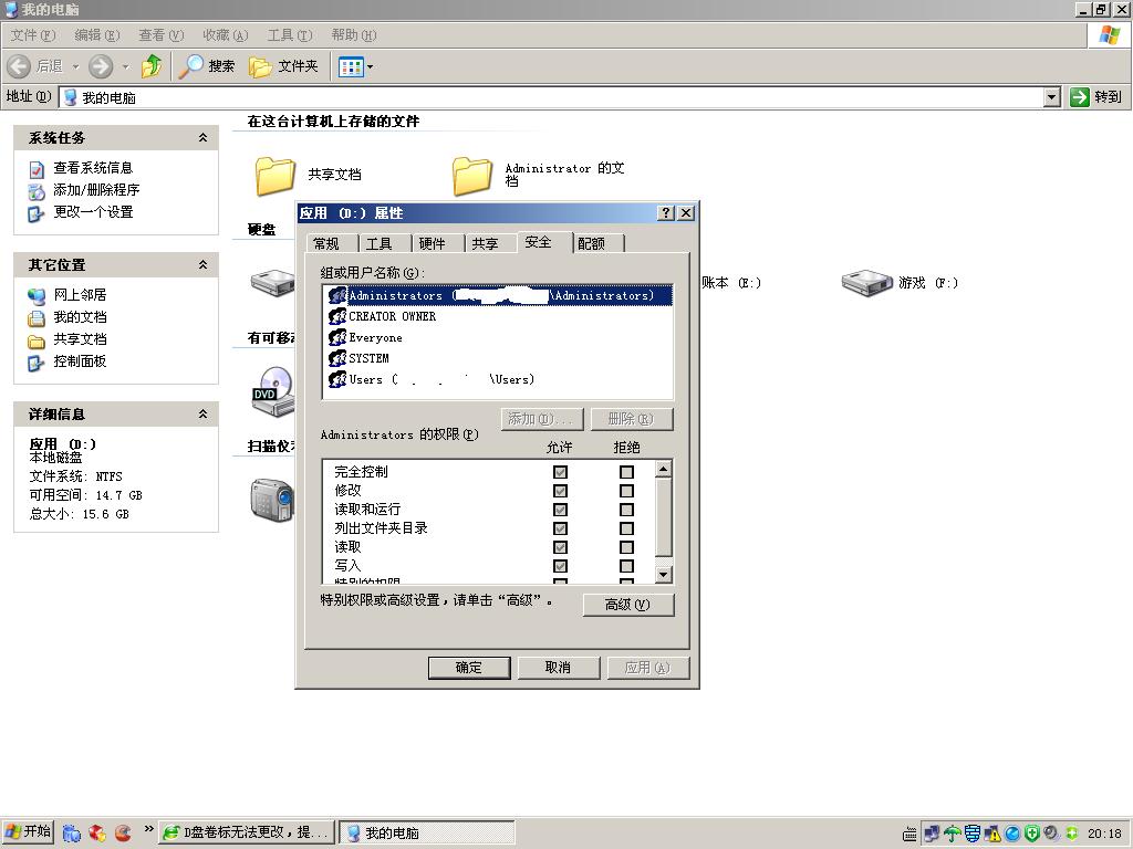D盘卷标不能更改,把要改的名字输入后,点击确定提示下图:我以为是权限的问题就去改权限可不允许,看图只有到安全模式下才能改,而且权限也可以设置,是什么原因呢?病毒还是软件的问题?