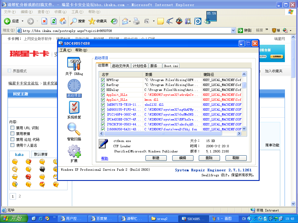 注意该项[AppInit_DLLs]修改:把<C:\WINDOWS\system32\a4rxQxCvNBMNnpqs.dll,kmon.dll>修改为<kmon.dll>即清空