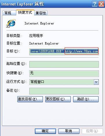2.右击桌面上的浏览器快捷方式选择属性看下目标指向是不是被改.如果是,删除这个快捷方式,去C:\ProgramFiles\InternetExplorer里重新建一个快捷方式到桌面即可或者把后面的网址删除即可解决;