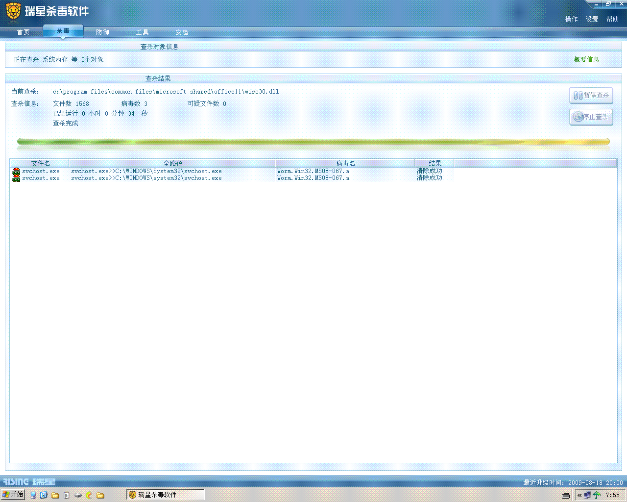 新装XP系统,装瑞星2009并升级。使用没多久,又中招。用瑞星能查杀,如下图: