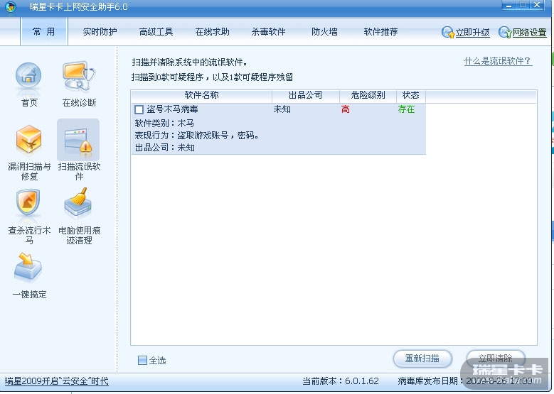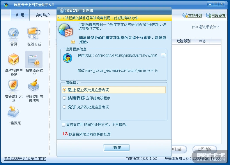 打开卡卡,进行扫描流氓软件,瑞星主动防卸立即提示: