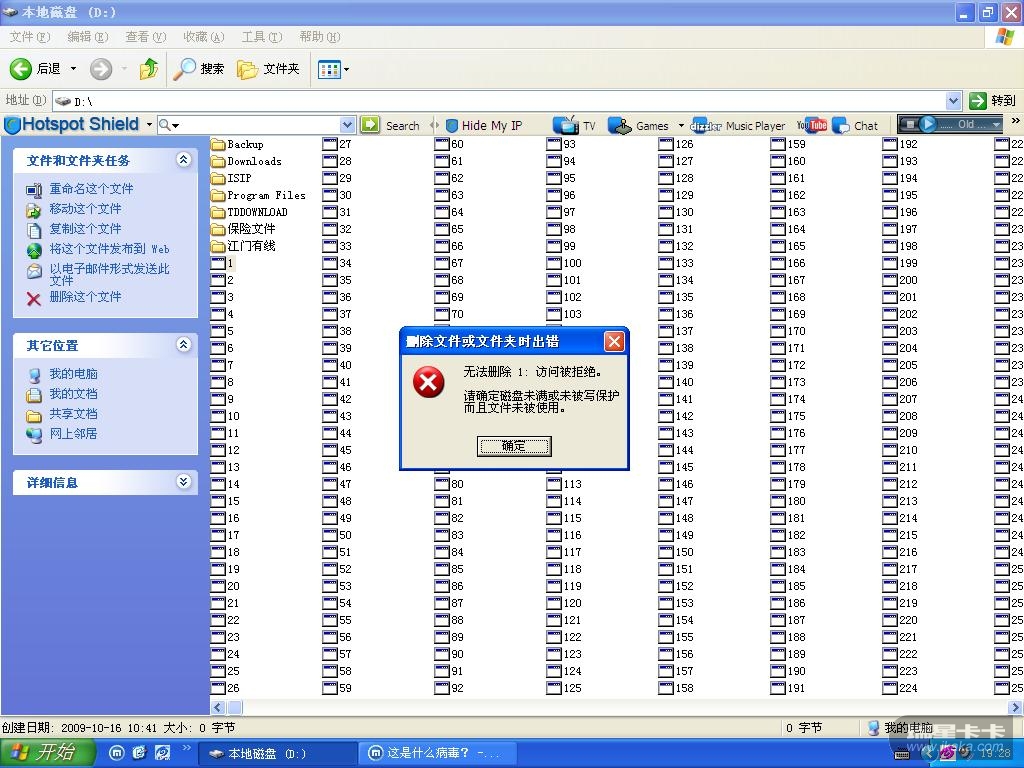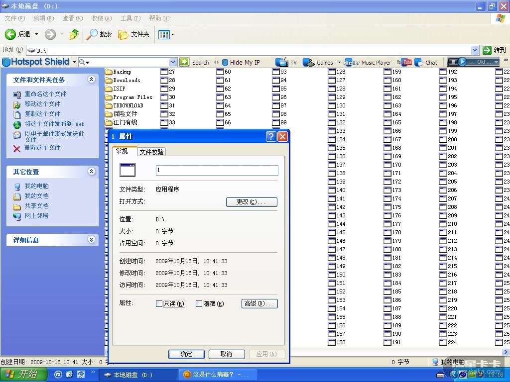 今天下了个文件打开后有异常(按确定按钮不关闭,但电脑没报警),我重启电脑后可正常使用。但发现电脑D盘中突然多了一万多个空文件(0字节,文件类型为应用程序),平时都有开360保险箱和瑞星,用上面两个软件查也没什么反应,删也删不掉(提示访问被拒绝)。现在电脑可以正常使用,就是任务管理器打不开,打开D盘比较慢,其他盘正常。那位指点一下,多谢!