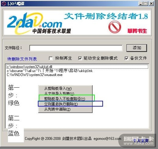 help=使用说明:删除时复制所有要删除文件的路径,在待删除文件列表里点击右键选择从剪贴板导入不检查路径,导入后在要删除文件上点击右键,选择立刻重启删除,电脑会重启进入DOS界面进行删除操作。运行xdelbox前最好卸载所有可移动存储介质(包括U盘,MP3,手机存储卡等)。