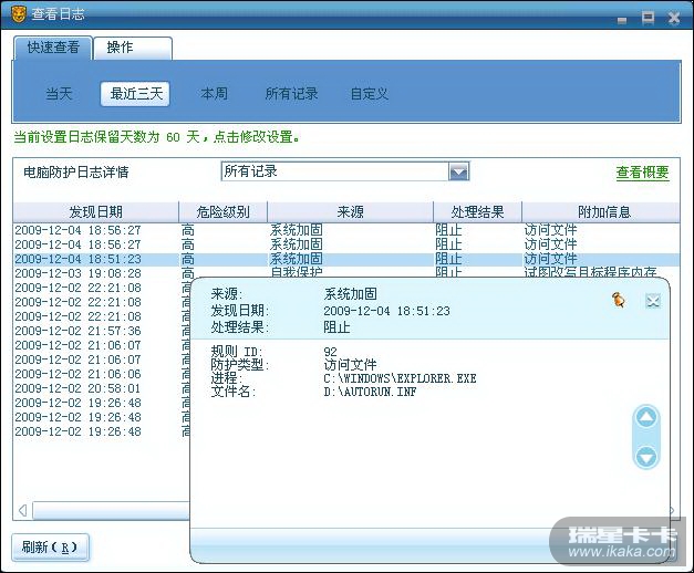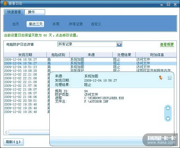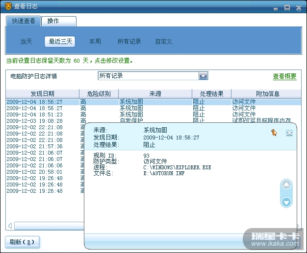 就算没有autorun.inf文件,系统自身的桌面进程也是会执行访问autorun.inf文件的命令的,2010瑞星的主动防御会常规性的阻止其访问autorun.inf文件的企图,并记录日志,哪怕没那autorun.inf文件,也一样阻止一次病记录日志。