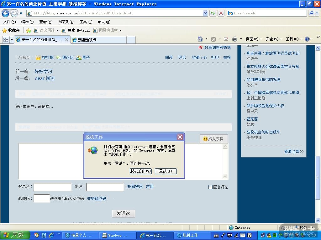 每次上网后,过一会就出现一个脱机工作的窗口,再打开网页就连不上去了。可是宽带连接还是连接着网的状态,请问这是怎么回事??地下有截图,联网的状态,出现脱机窗口
