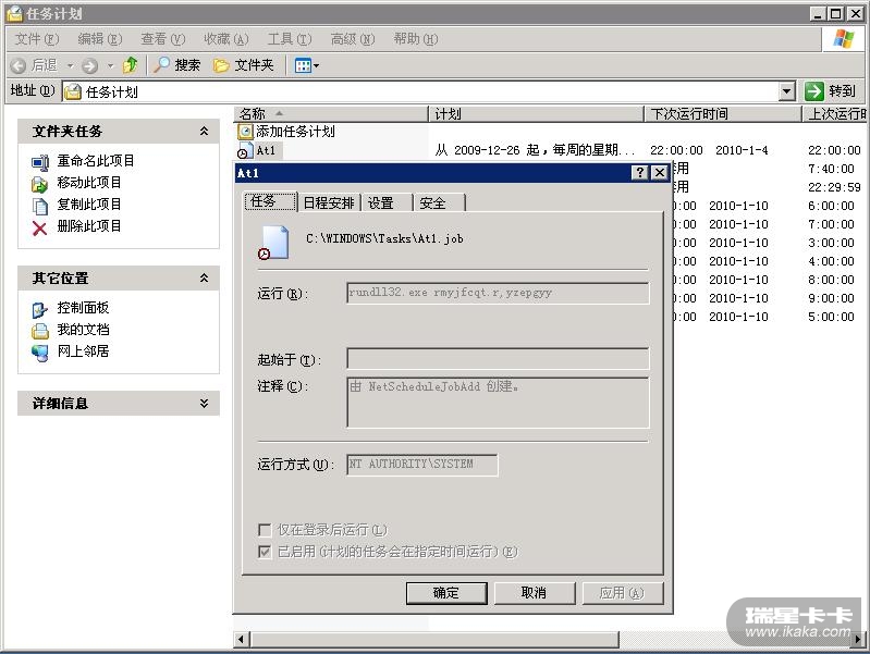 最近好多电脑在计划任务中会自动生产一个名叫"At1"的计划任务,并且每天定时执行,执行的目标是rundll32.exe,每次把At1.job删除后没多久马上又有了,请各位大虾指点一二,谢谢