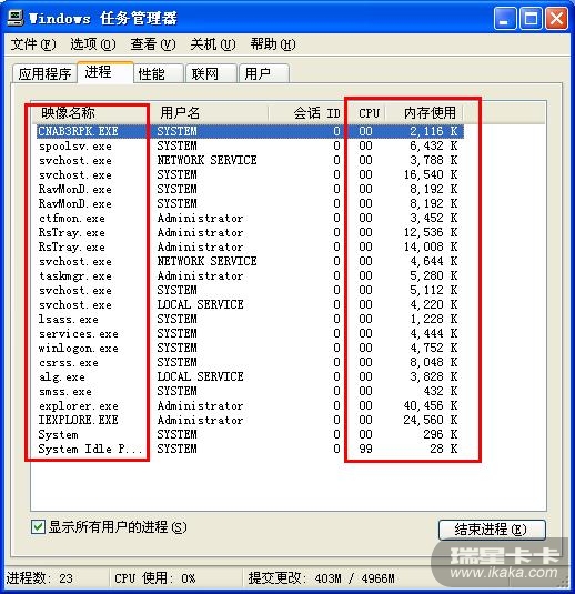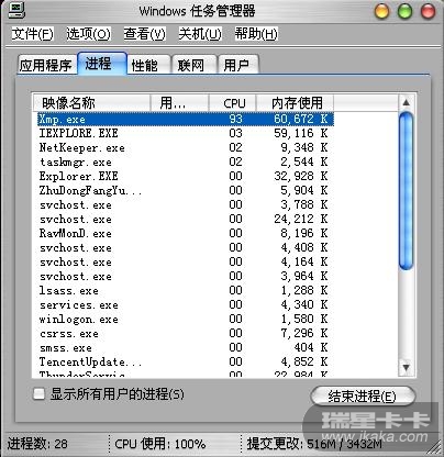 3、附图中显示一个XMP.EXE的进程占据系统93%的资源,自己看看这个进程属于什么软件,然后到该软件的官方论坛上咨询下可能原因(我这里网络尚处在管制状态,大部分网站不能上,自己找找吧)。