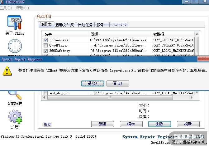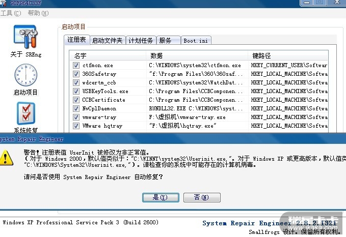 打开SREngLdr.EXE 点击启动项目出现提示警告 注册表值 UserInit 被修改为非正常值(对于 windows 2000,默认值类似于:“C:\WINNT\system32\Userinit.exe”。对于Windows XP或更高版本,默认值类“c:\WINDOWS\System32\Userinit.exe,")。请检查你的系统中可能存在的计算机病毒。