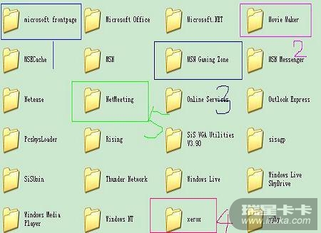 6楼已经介绍了microsoft frontpage,movie maker,msn gaming zone;现在补充下:xerox文件夹作为一些图像处理软件作临时空间用;netmeeting是Windows系统自带的网上聊天软件。