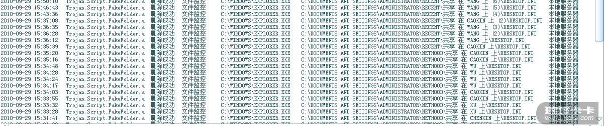 今天早上开始,从网上邻居里打开同事的共享文件夹,然后打开一个程序(比如EXCEL等),就回被瑞星拦截一次,关闭会再次被拦截一次,只要打开一次就拦截一次,而且杀毒也只有在图片中的那些“共享在 XXX 上”这个文件夹下的desktop.ini这个位置发现病毒,每次都是删除成功。