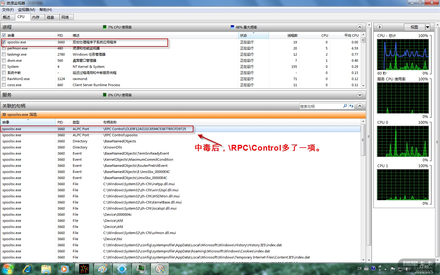 中此毒后,用WIN7的资源监视器查看spoolsv.exe进程关联的句柄,也能发现中毒后的蛛丝马迹: