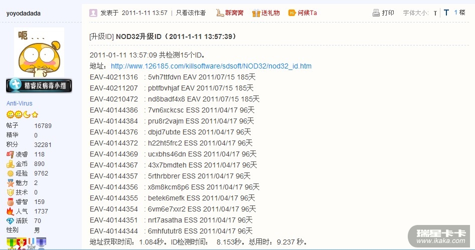今天俺去精睿论坛里找NOD 32的免费升级ID,在一个帖子中找到了,帖子地址如下: