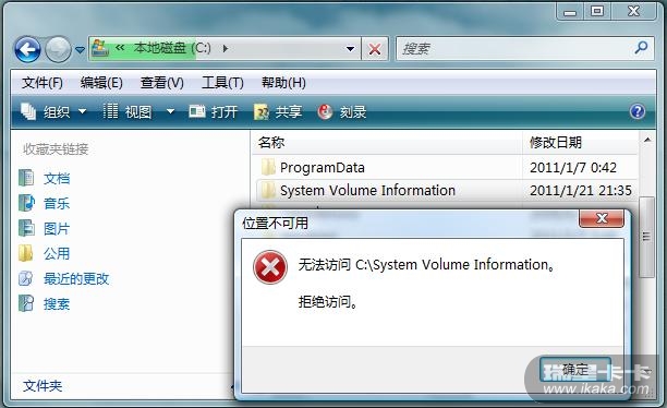 不能打开的应该是system volume information这个文件夹,这里保留了系统还原点的备份文件,也是隐藏的系统文件夹。VISTA操作系统默认设置任何一般管理员账户无权访问该文件夹,只有system账户可访问该文件夹。详见图2。