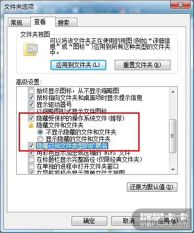 要是不想见那些隐藏文件(夹),就去改“文件夹选项”的相关设置,像图3标示的那样完成设置后,你就找不着它们了: