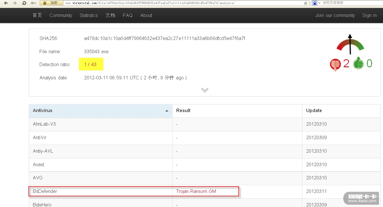 病毒样本来自卡饭。virustotal扫描结果只有BitDefender一家报毒。