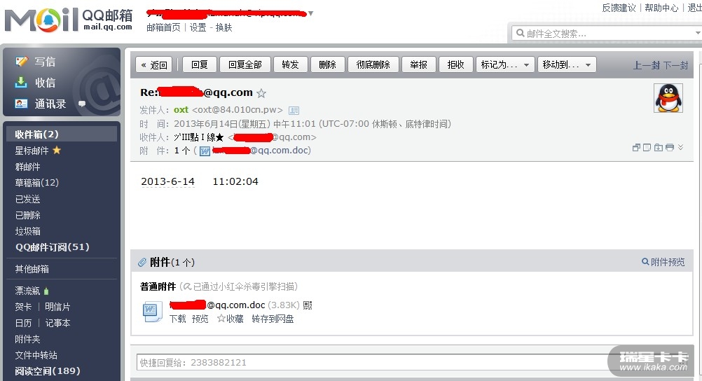 瑞星卡卡安全论坛技术交流区反病毒/反流氓软件论坛 收到一个带有“XX.doc”(XX为我的QQ邮箱地址)附件的邮件?