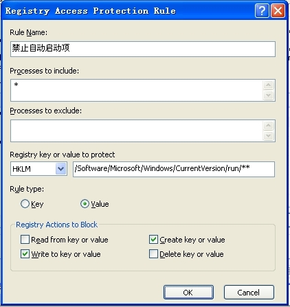 规则名下来2个框同上,第3个左边HKLM是HKEY_LOCAL_MACHINE的缩写,右边是具体路径。再往下两个单选,简单解释一下:Key在注册表编辑器里相当于文件夹,Value相当于具体文件(其实是单个键)。最下面4个多选,除了Write选项是新建的意思,其它没有什么可解释的。