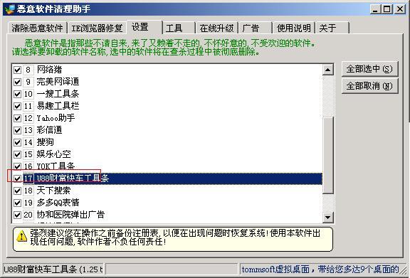 流氓软件清理助手,目前可以清理下列流氓软件:U88 一搜工具条 完美网译通 CNIC中文上网 博采网摘 百度搜霸 3721上网助手 360搜 Dudu下载加速器 很棒小秘书 网络猪 划词搜索。