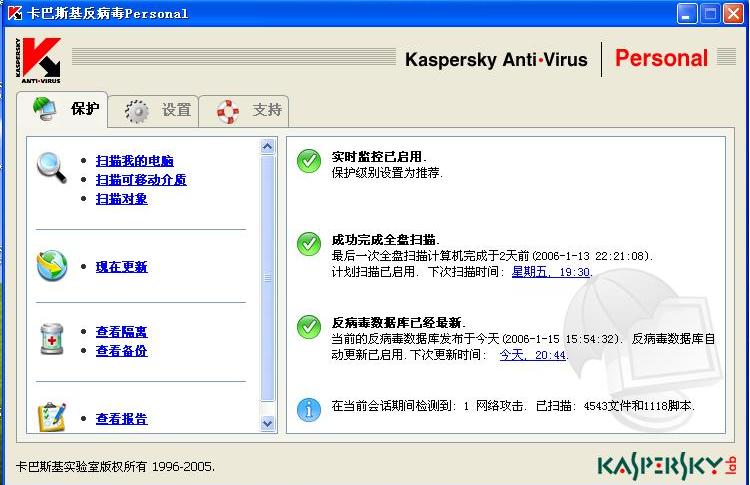 电脑城,买了个卡巴斯基个人版和个天网个人版,回家来装上感觉不错,遂与大家同分享我的喜悦,呵呵