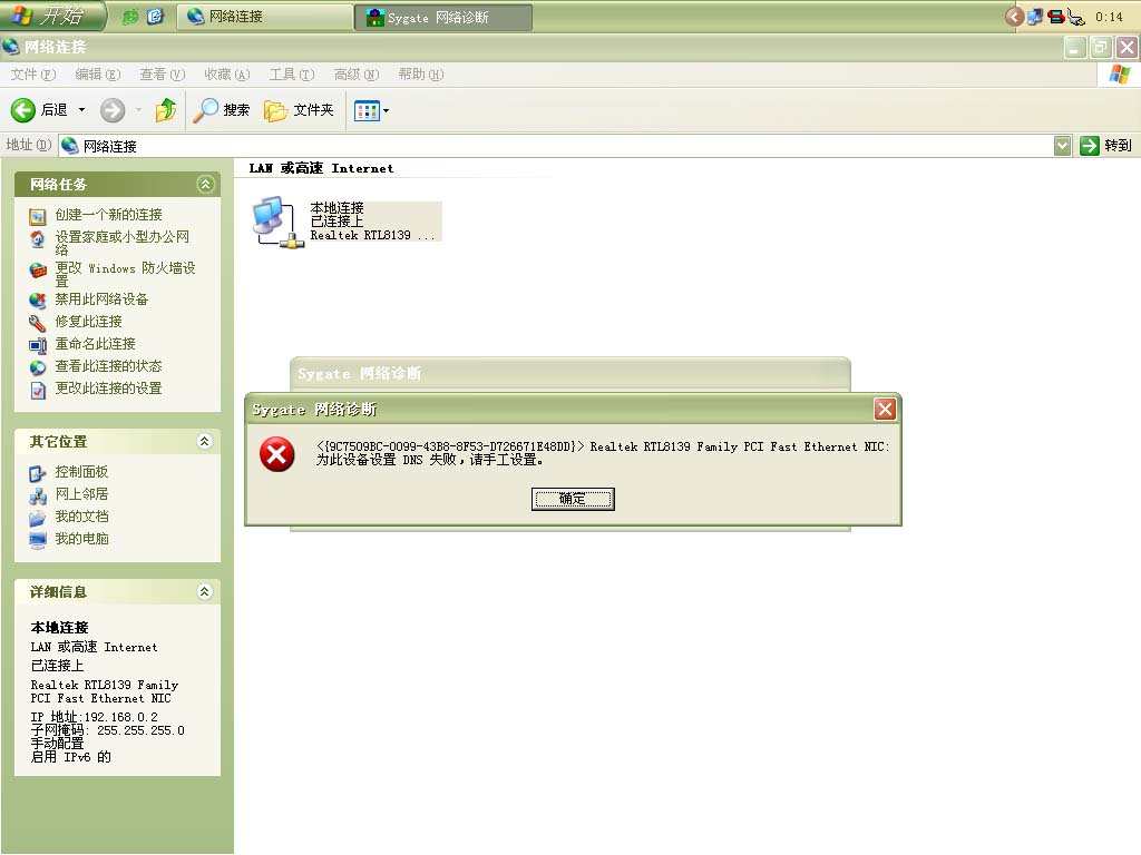 按照原来的帖子上的步骤 已经基本建立局域网 2机可以互访 但是从机依然无法上网 诊断时出现如下对话框 请问如何解决?