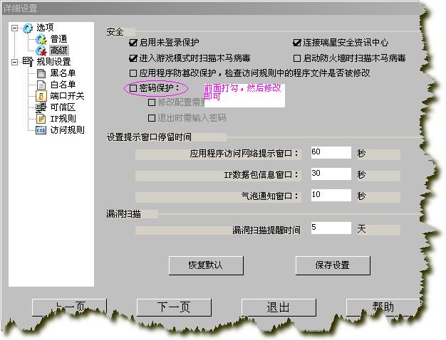打开防火墙主程序,点设置-详细设置-高级-密码保护前打勾,然后修改即可。