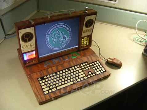 这是一位来自德克萨斯小伙子的一个改造作品,它看上去像一台笔记本电脑,木制的外观让它有点古香古色的味道,这款改造的主要部件也集中在键盘、显示器、主板以及机箱上。