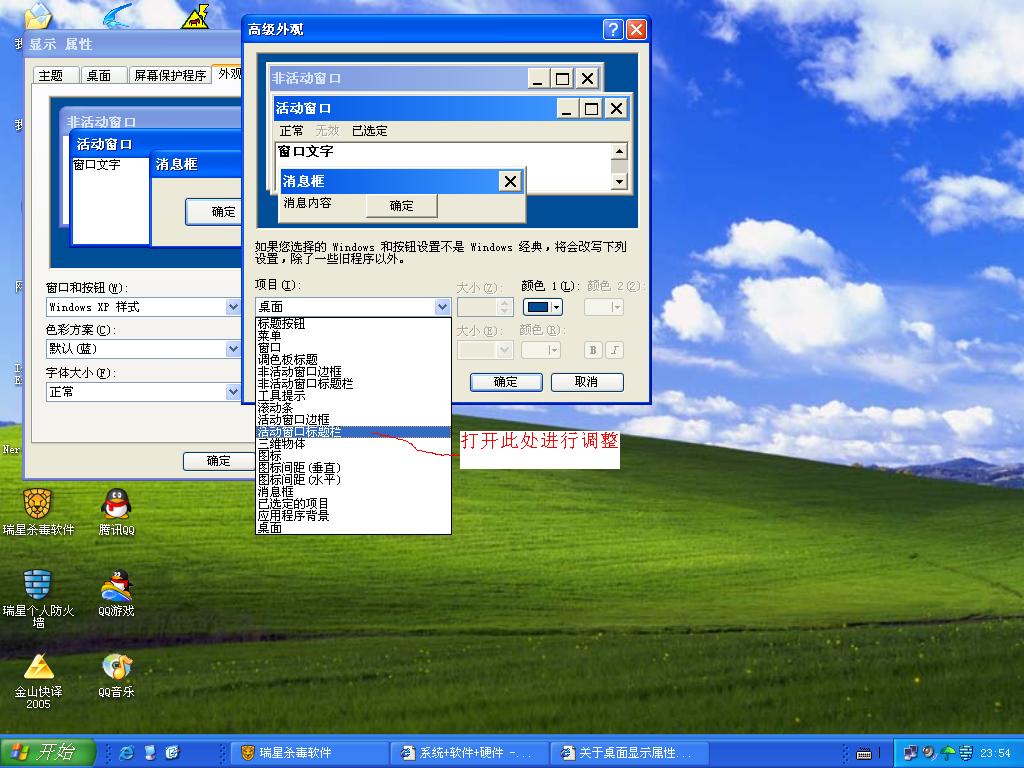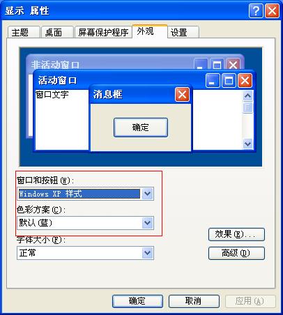 我在桌面的显示属性里设置了外观里的高级,改变了活动窗口和消息框的颜色(我的WINDOWS和按钮设置不是WINDOWS经典。用的是WINDOWS XP,色彩方案银色)为什么活动窗口和消息框还是老样子啊?