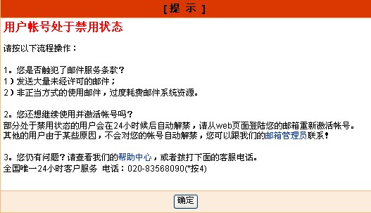 我给网易管理员发邮件,结果管理员说:“经查询,您的邮箱在短时间(一般是一天)内进行多线程上传/下载文件或收发邮件的数量超过服务器上限,占用了网络带宽,严重影响其他用户的使用,故被禁用,不属于可解除禁用状态的邮箱。”